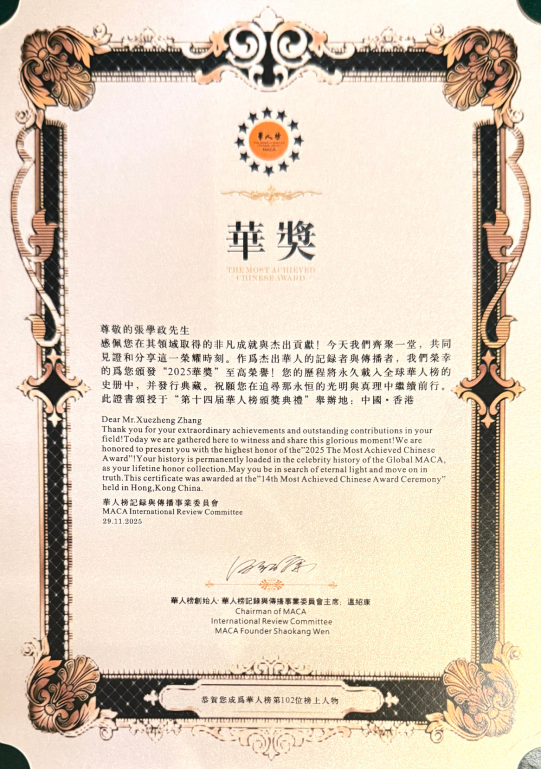 近日,第十四届华人榜MACA(华奖)颁奖典礼在香港举行。凭借在半导体产业的突出贡献与影响力,张学政先生荣获“企业家成就奖”。这一荣誉不仅是对其领导力与企业家精神的高度认可,也是对公司高端制造、践行全球化使命的权威背书,彰显了民营企业在全球高科技领域的核心价值。